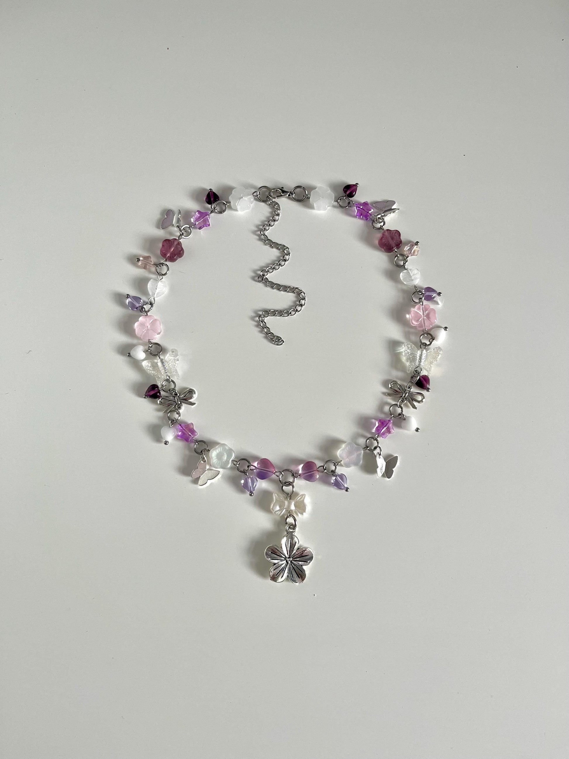 "Fleeting Dream" Necklace and Bracelet - Inspired by Castorice from Honkai: Star Rail. Carry a touch of her ethereal beauty with delicate flower, butterfly, and bow charms in dreamy white and purple hues.